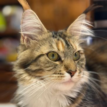 Esme brings it all to the table! With her striking green eyes, she is a blotched torbie (tortie tabby) showcasing a truly exotic pattern. As a CFA registered Maine Coon, she represents the best of Maine Coon breeding.